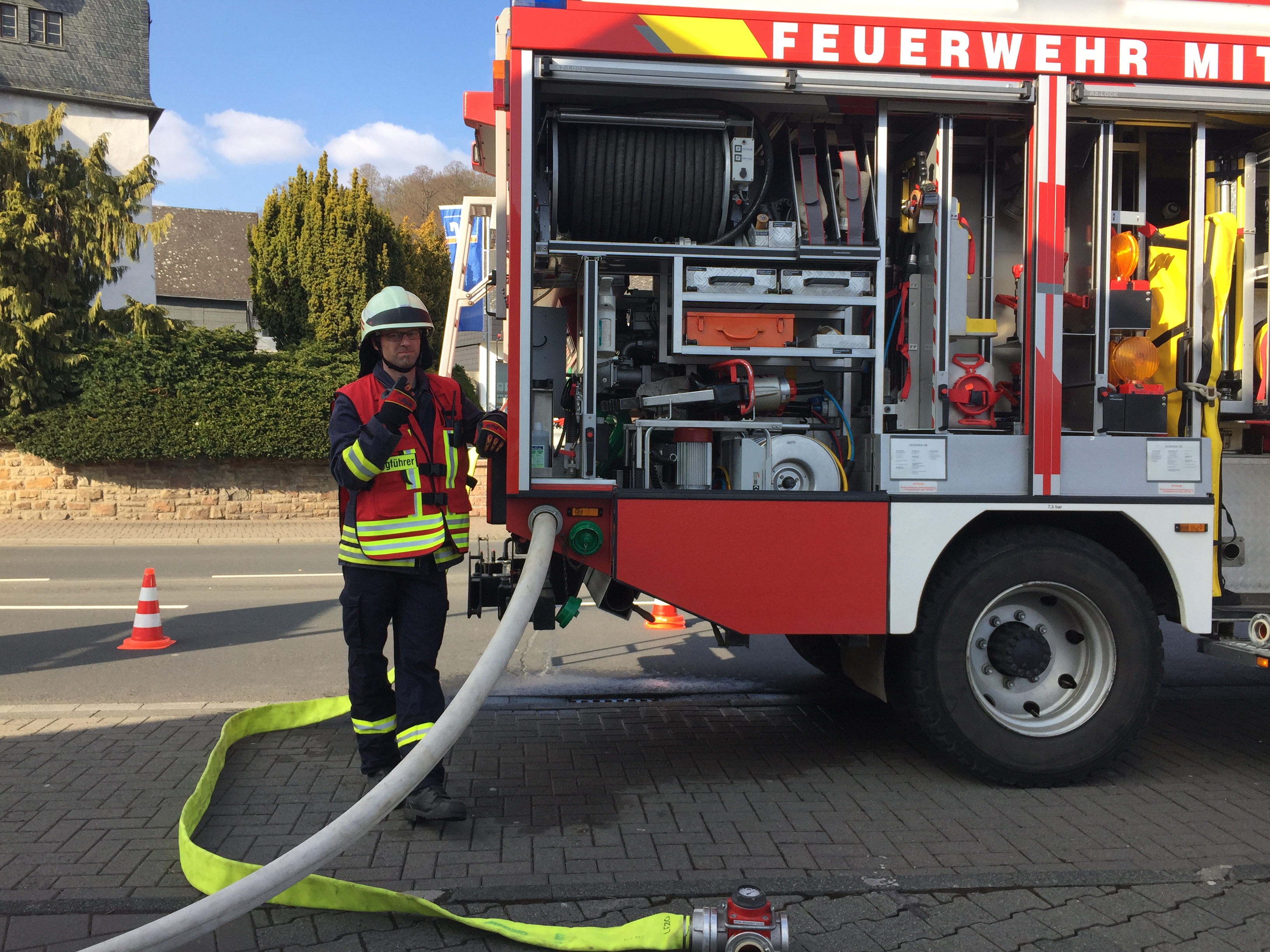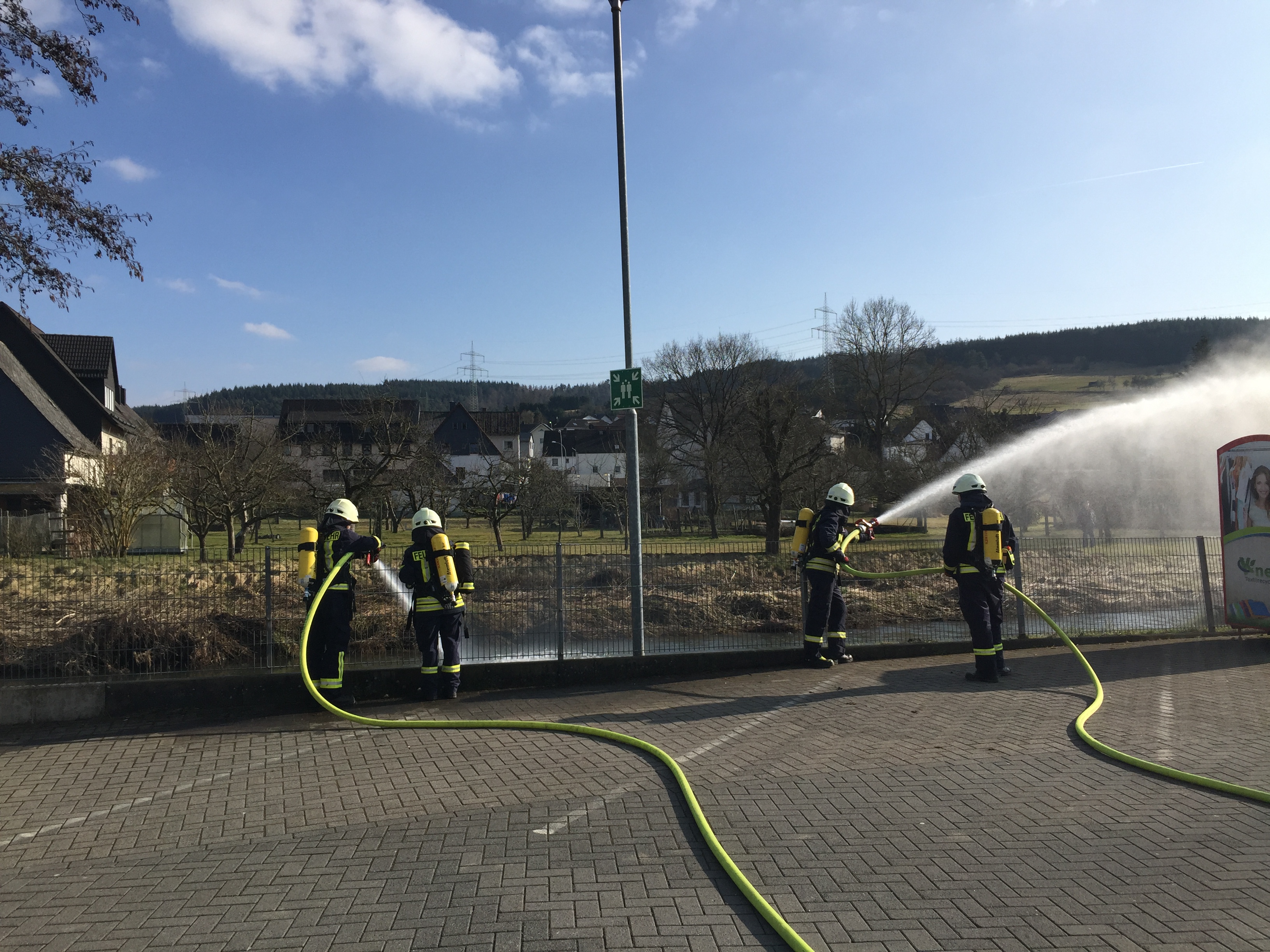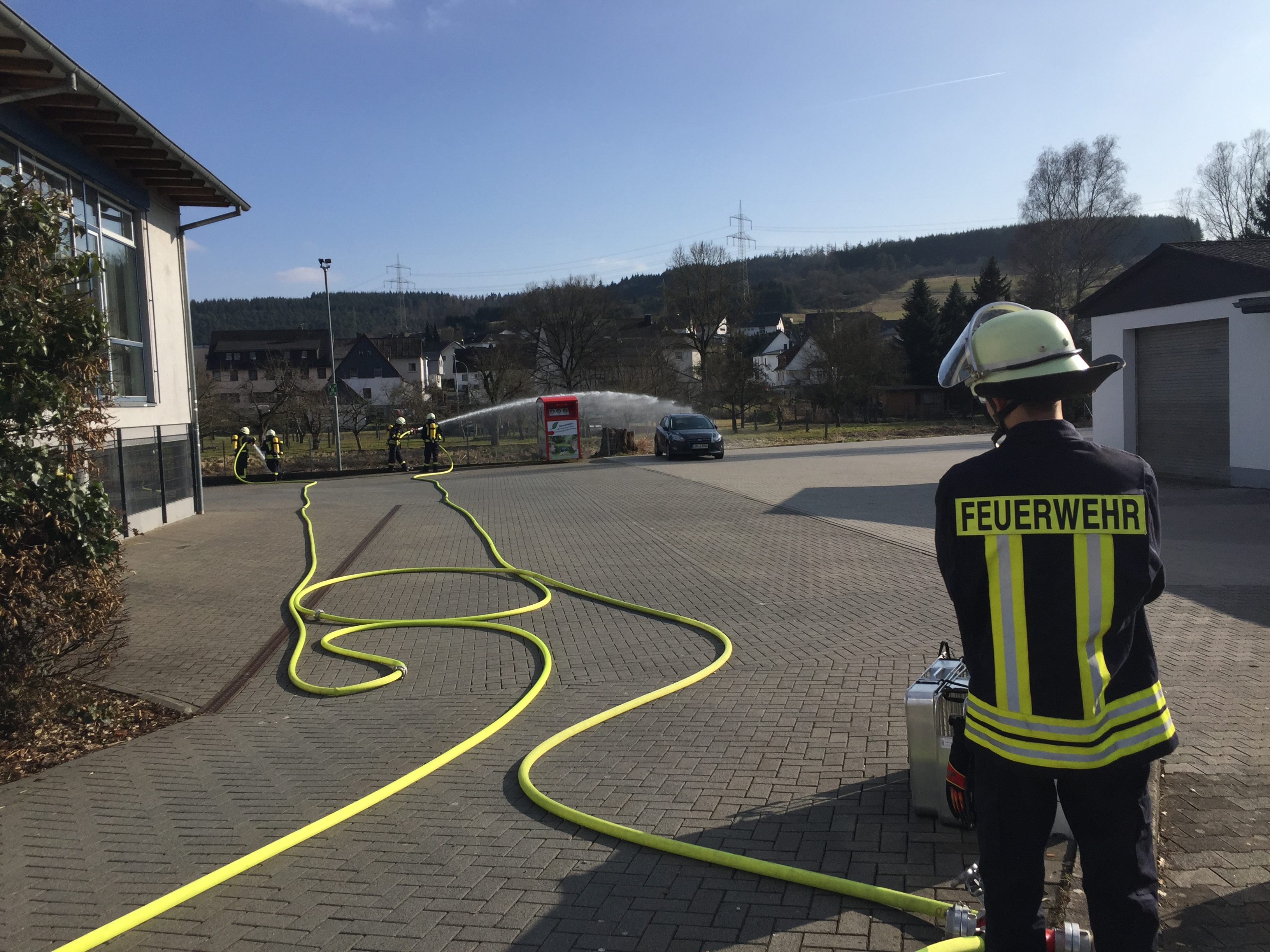 Am 24.03.18 wurde bei strahlendem Sonnenschein ein Brand im Dorfgemeinschaftshaus in Bicken geübt. Angenommen wurde eine Veranstaltung mit ca. 150 Besuchern, bei der es in der Küche zu einer Fettexplosion kam. Daraufhin begann es in der Küche zu brennen und die Räume wurden stark verraucht. Trotz einer sofort eingeleiteten Evakuation befanden sich noch einige Besucher im DGH, die sich alleine nicht retten konnten. Schnell wurden mehrere Trupps unter Atemschutz in das Gebäude geschickt, um die Menschen in Sicherheit zu bringen und gegebenenfalls an den Rettungsdienst zu übergeben. Zur gleichen Zeit wurde von anderen Trupps vor dem Gebäude eine unabhängige Wasserversorgung aufgebaut, damit der Brand schnell gelöscht werden kann. Im Verlauf der Übung musste zudem noch ein Brand auf dem Dach des Dorfgemeinschaftshauses gelöscht werden. Am Ende wurde die Übung noch ausführlich besprochen.