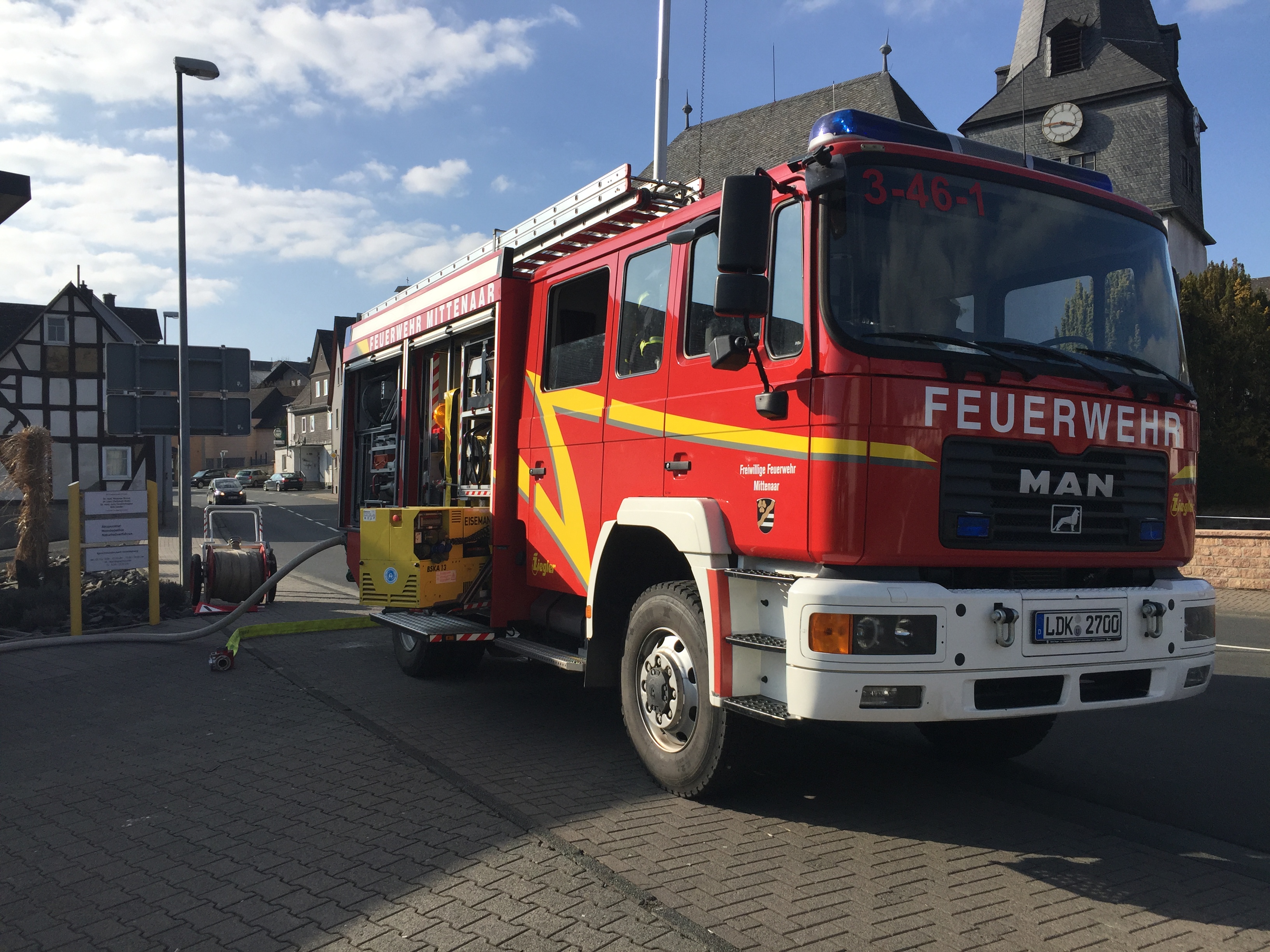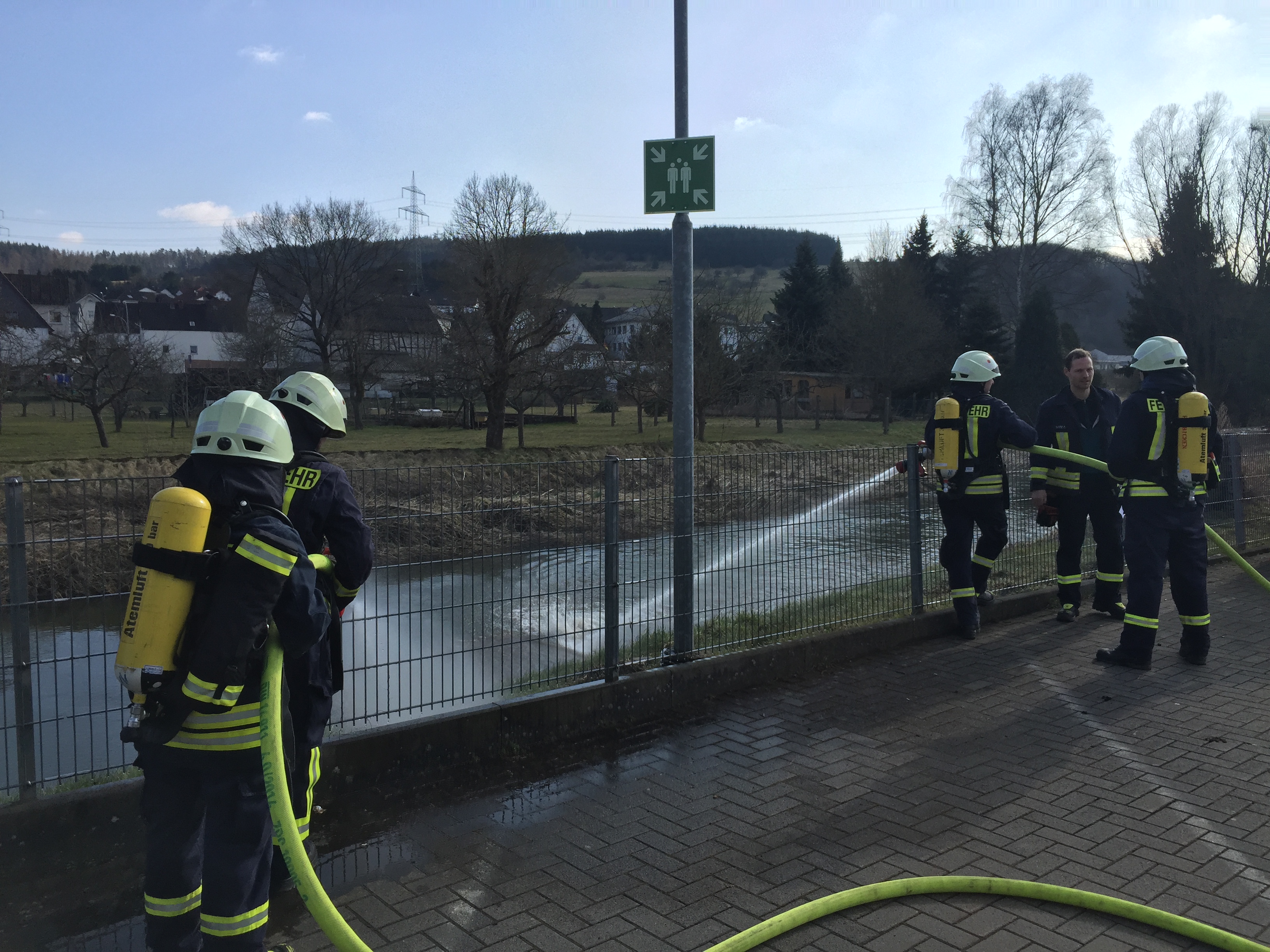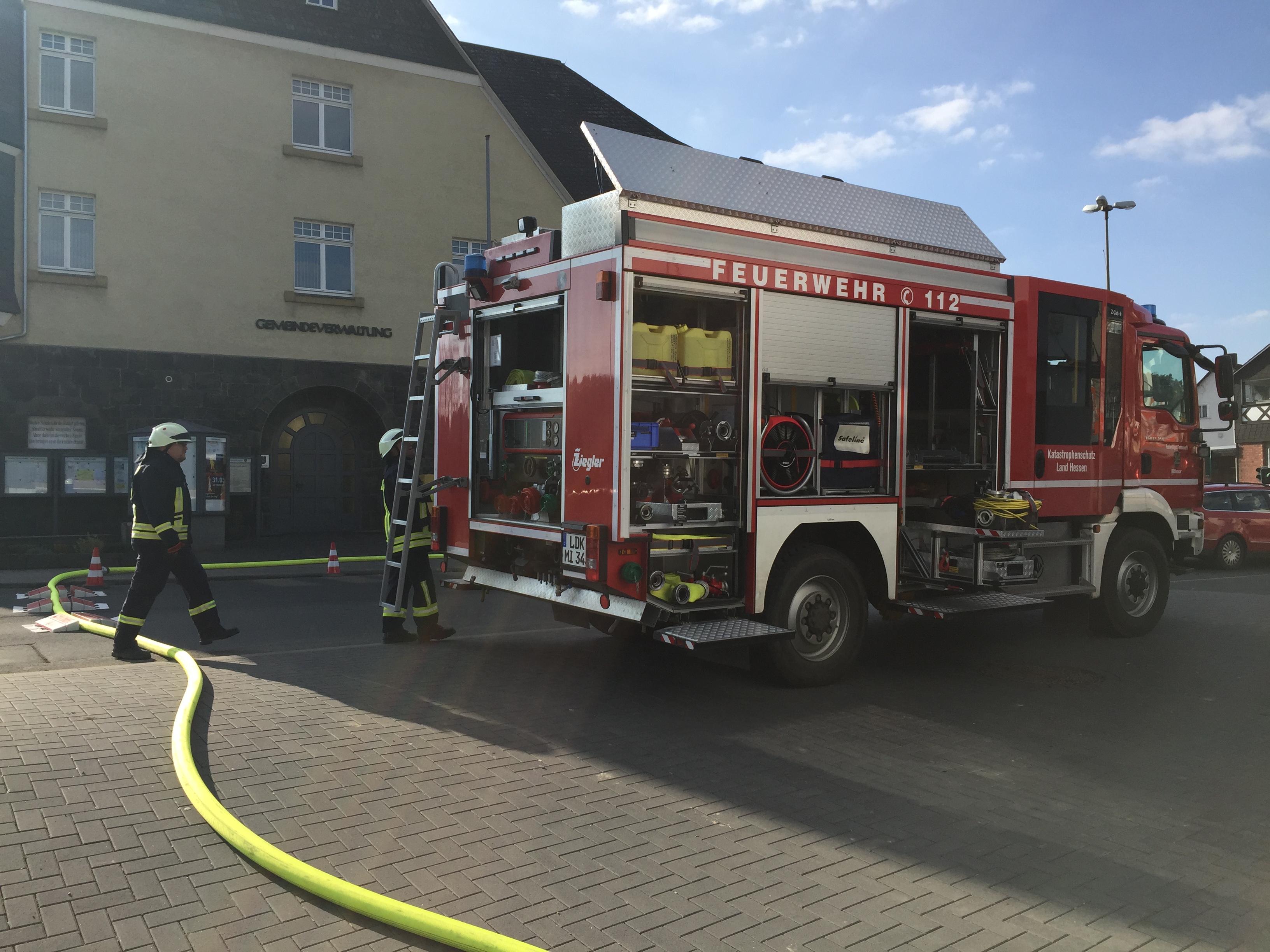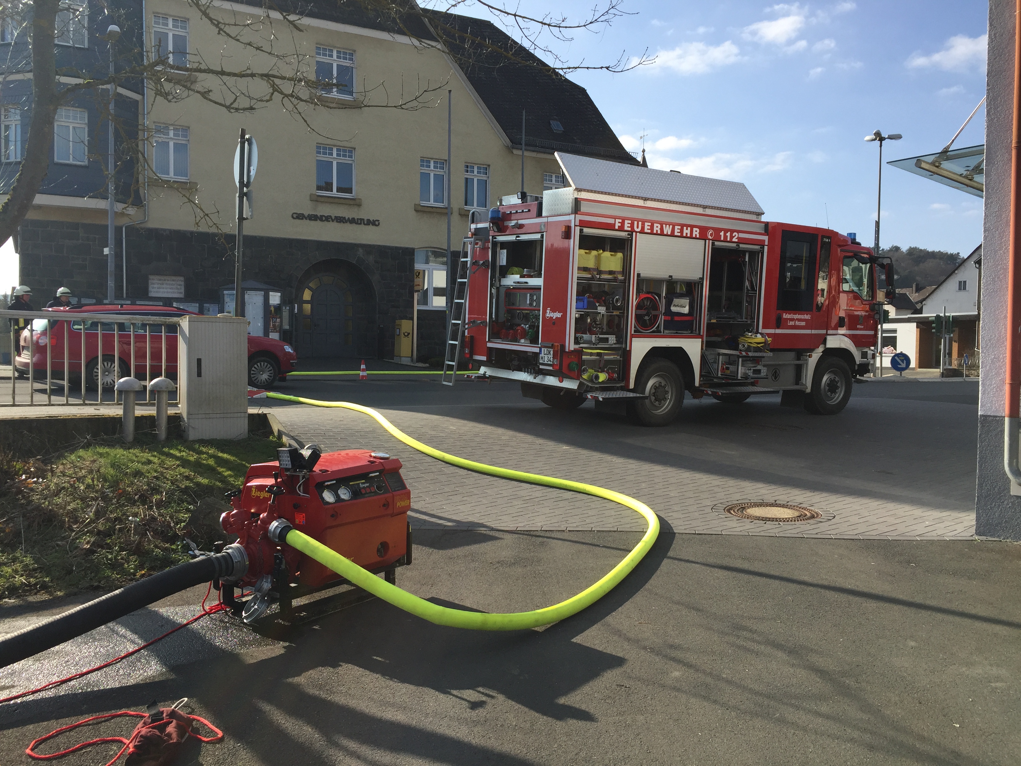 Am 24.03.18 wurde bei strahlendem Sonnenschein ein Brand im Dorfgemeinschaftshaus in Bicken geübt. Angenommen wurde eine Veranstaltung mit ca. 150 Besuchern, bei der es in der Küche zu einer Fettexplosion kam. Daraufhin begann es in der Küche zu brennen und die Räume wurden stark verraucht. Trotz einer sofort eingeleiteten Evakuation befanden sich noch einige Besucher im DGH, die sich alleine nicht retten konnten. Schnell wurden mehrere Trupps unter Atemschutz in das Gebäude geschickt, um die Menschen in Sicherheit zu bringen und gegebenenfalls an den Rettungsdienst zu übergeben. Zur gleichen Zeit wurde von anderen Trupps vor dem Gebäude eine unabhängige Wasserversorgung aufgebaut, damit der Brand schnell gelöscht werden kann. Im Verlauf der Übung musste zudem noch ein Brand auf dem Dach des Dorfgemeinschaftshauses gelöscht werden. Am Ende wurde die Übung noch ausführlich besprochen.