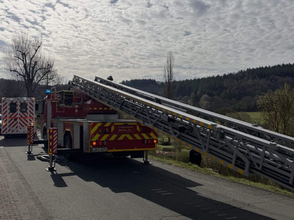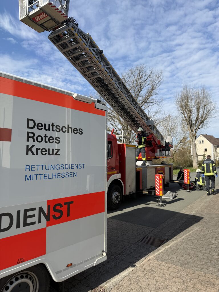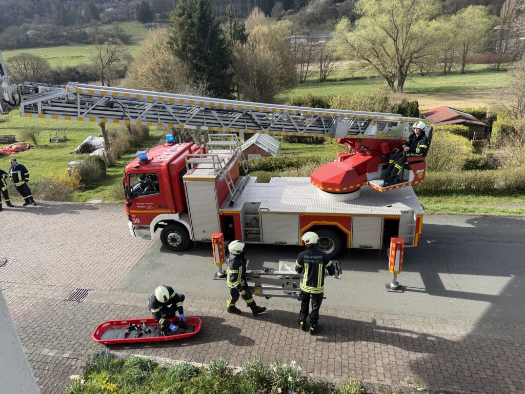 Mithilfe der Drehleiter der Feuerwehr Herborn konnte die Person schonend aus dem Gebäude gebracht werden. In enger Zusammenarbeit mit dem Rettungsdienst wurde die Person anschließend zügig und sicher zum bereitstehenden Rettungswagen transportiert.